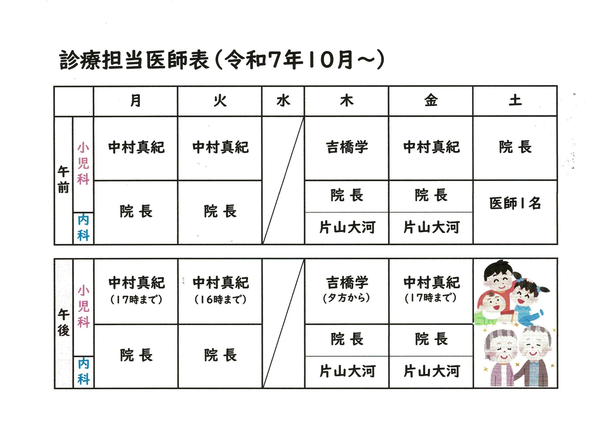 | 予防接種 および 乳幼児健診 15:00 ~ 16:00 | ● | ● | 休 | ● | ● | 休 |