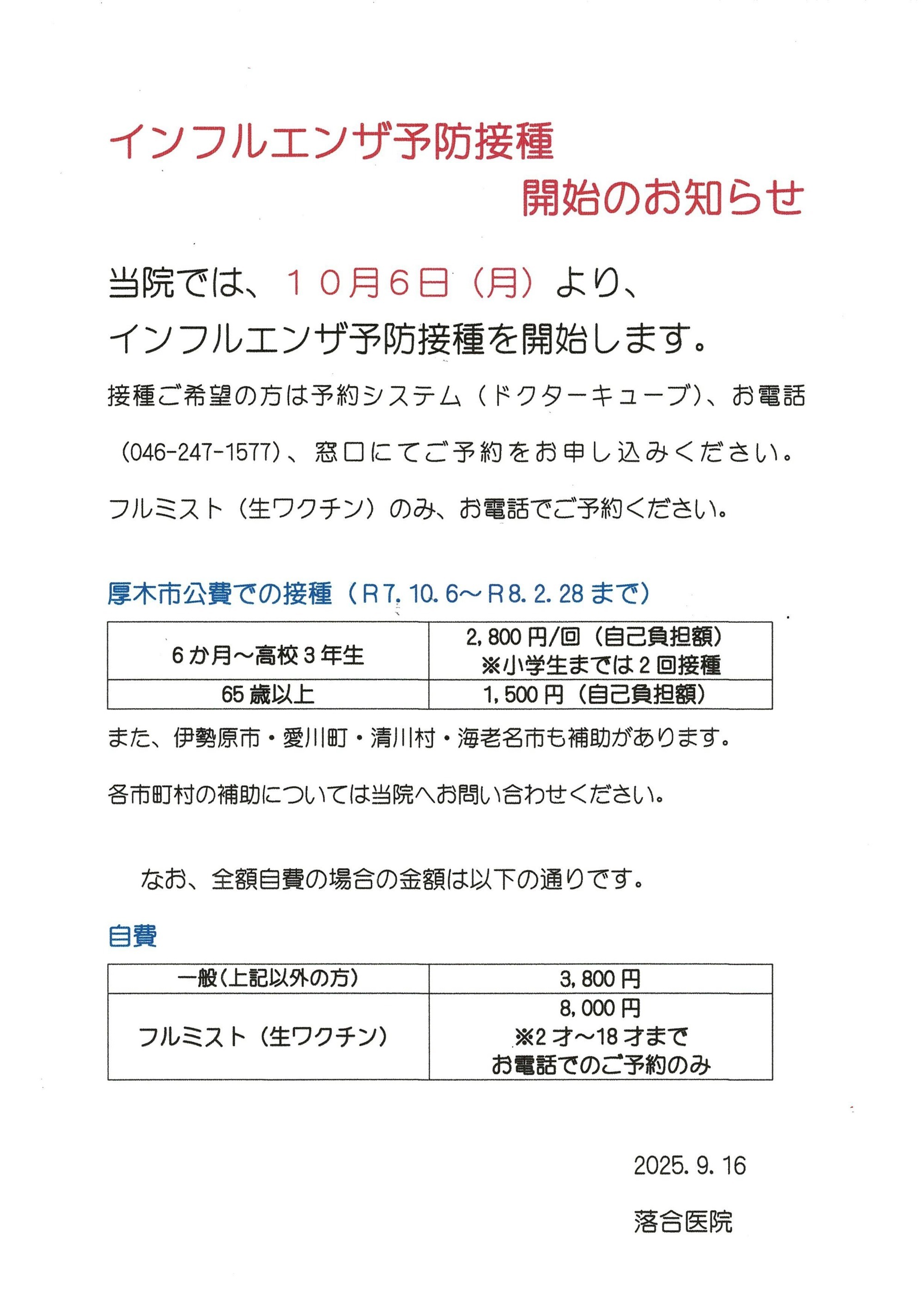 ■インフルエンザ予防接種開始のお知らせ(2025/9/17)